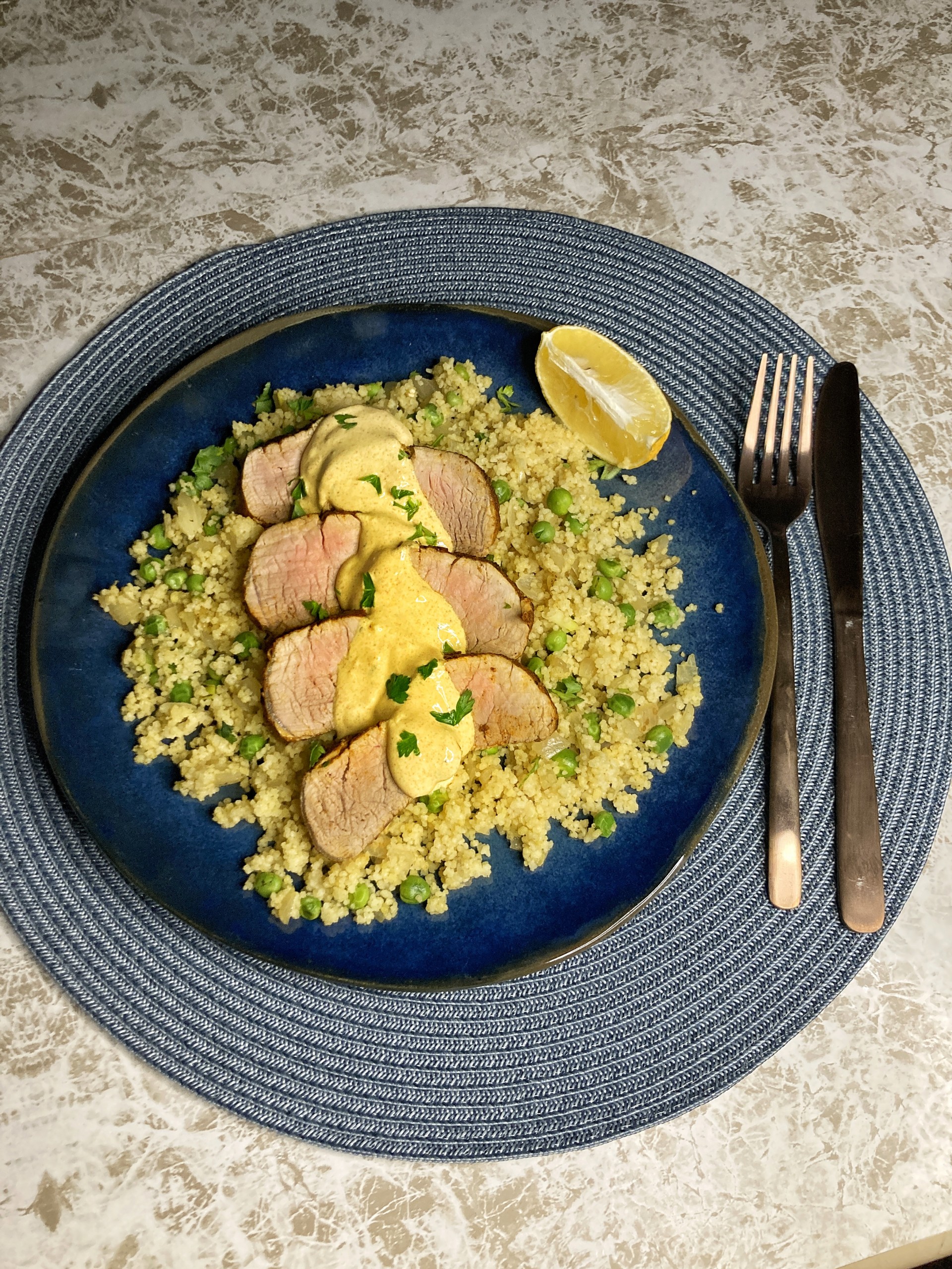 sa kuskusom, graškom i arapskim sosem od jogurta i limuna