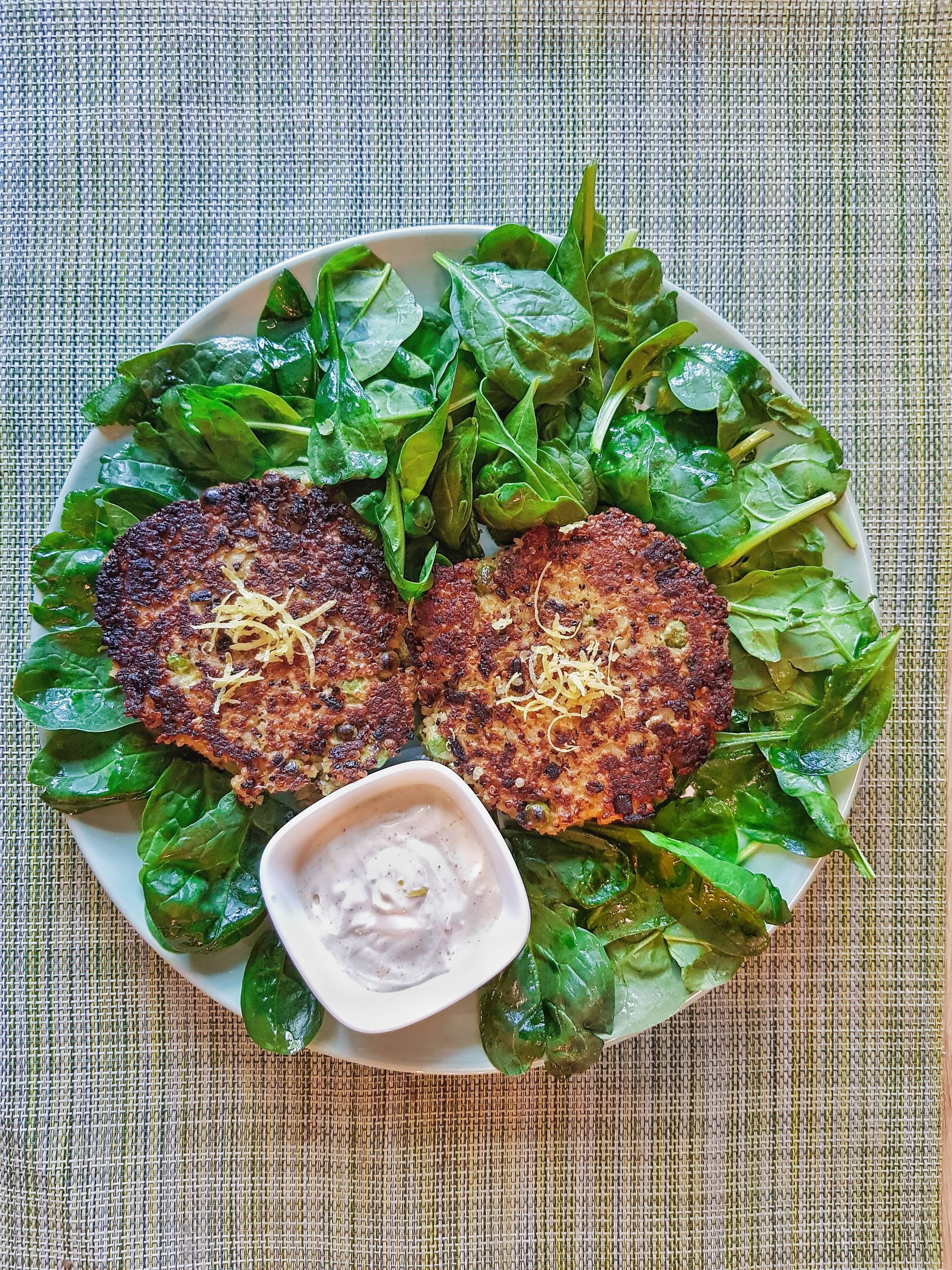 Miks kinoe, graška, luka, fete i limuna čine savršenu bazu za ove vege pljeke. Baby spanać ide kao prilog, a sos od pavlake, majoneza i slatke paprike savšen je da ga prelijete preko pljeskavica. Ne sumnjamo da ćete polizati tanjir 🙂